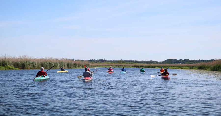 Nach unserer Mittagspause sind wir nochmals ins Poldergebiet hinein gepaddelt. Da Stettin immer näher kam, war auch schon etwas mehr Betrieb auf dem Wasser. Im Poldergebiet haben wir also andere Paddler sowohl sitzend in Kajaks als auch stehend auf ihren Boards getroffen. An einer großen Auto- und Eisenbahnbrücke haben wir ausgesetzt. Dort hat Jörg bereits auf uns gewartet, der mit drei Booten und vier Autofahrern zurück nach Mescherin gefahren ist. Wir haben es uns gemütlich gemacht, gelesen und gequatscht, bis die Autopendler wieder zurück waren. Dann wurden die Boote verladen, und alle fuhren zurück nach Mescherin.