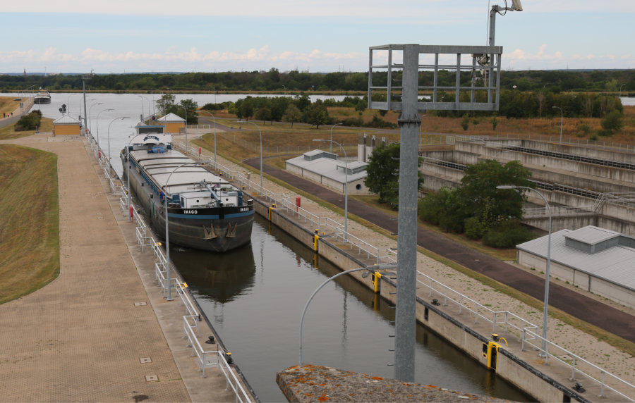 Als nächstes stiegen wir den Turm zur Sparschleuse Magdeburg Rothensee nach oben und haben von dort einen grandiosen Blick auf die Schleuse und die Sparbecken. Die Schleusenkammer ist circa 12,50 m breit und 190 m lang. Sie hat eine vom Elbwasserstand abhängige Fallhöhe von 10,45 bis 18,46 m. Unter dem Gesichtspunkt, den Wasserverbrauch beim Schleusen zu reduzieren, wurde die Schleusenanlage als Sparschleuse konzipiert. Östlich neben der Schleusenkammer wurden jeweils drei gestaffelt übereinander angeordnete Sparbecken gebaut. Durch die Becken wird eine Wasserersparnis von etwa 60 Prozent des Schleusungswasserbedarfs ermöglicht. Nur die restlichen 40 Prozent des benötigten Kammerinhalts werden bei einer Schleusung zum oberen Mittellandkanal aus dieser oberen Haltung entnommen bzw. bei einer Schleusung nach unten in die untere Haltung abgelassen. Dieses Verlustwasser wird durch Rückpumpen in die obere Haltung ersetzt, da der Mittellandkanal so gut wie keine natürlichen Zuflüsse hat.